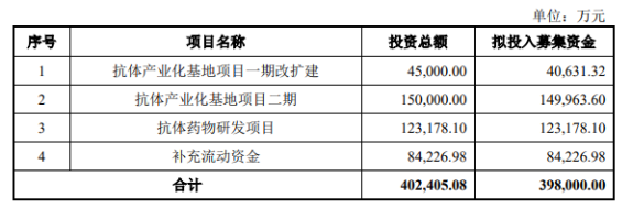 募資用途:此次IPO擬募資39.8億元,其中,4.06億元用于抗體產(chǎn)業(yè)化基地項目一期改擴建,14.99億元用于抗體產(chǎn)業(yè)化基地項目二期,12.32億元用于抗體藥物研發(fā)項目,8.42億元用于補充流動資金。