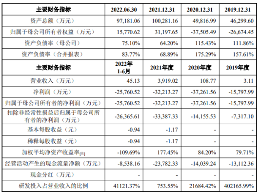2019年至2022年1-6月,公司的營業(yè)收入分別為3.11萬元、108.77萬元、3,919.02萬元、45.13萬元,歸母凈利潤分別為-15,797.99萬元、-37,261.56萬元、-32,213.27萬元、-25,760.52萬元。