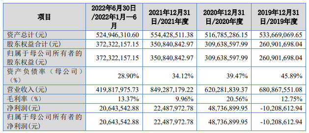 2019年至2022年1-6月,公司的營業(yè)收入分別為6.81億元、6.20億元、8.49億元、4.20億元;同期對應的歸母凈利潤分別為-1020.86萬元、4873.69萬元、2248.80萬元、2064.35萬元。