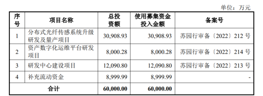 募資用途:此次IPO擬募資6億元,用于分布式光纖傳感系統(tǒng)升級(jí)研發(fā)及量產(chǎn)項(xiàng)目、資產(chǎn)數(shù)字化運(yùn)維平臺(tái)研發(fā)項(xiàng)目、研發(fā)中心建設(shè)項(xiàng)目、補(bǔ)充流動(dòng)資金。