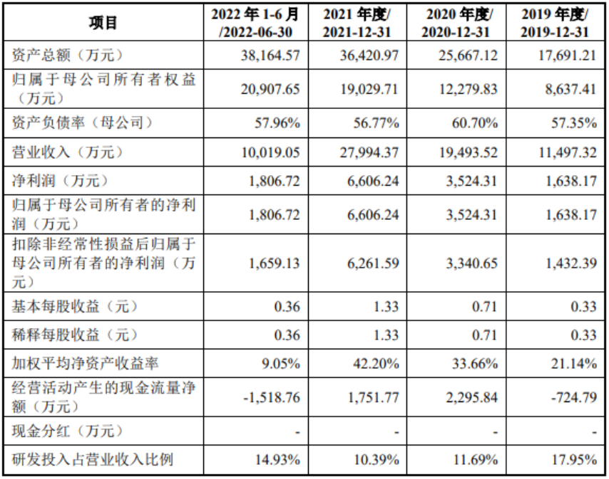 2019年至2022年1-6月,公司的營(yíng)業(yè)收入分別為1.15億元、1.95億元、2.80億元和1.00億元;歸母凈利潤(rùn)分別為1,638.17萬(wàn)元、3,524.31萬(wàn)元、6,606.24萬(wàn)元、1,806.72萬(wàn)元。