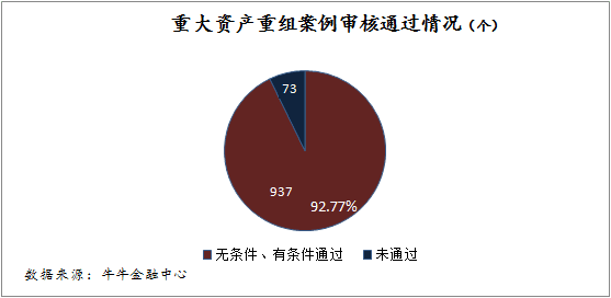 2008年至2016年一季度,證監(jiān)會并購重組委審核了1010個重大資產(chǎn)重組案例。其中無條件、有條件通過的案例有937個,未予通過的案例有73個,審核通過率超90%,可見監(jiān)管層對于并購重組、再融資持認可態(tài)度,鼓勵、支持上市公司通過并購重組做大做強。