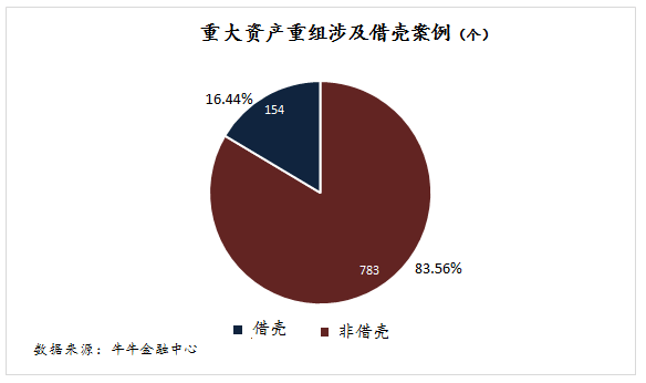 牛牛金融中心根據(jù)證監(jiān)會審核的有條件、無條件通過的937個上市公司重大資產(chǎn)重組案例,逐一篩選出涉及借殼行為的例子154例,占所有審核通過案例的16.44%,可見借殼成了上市的重要途徑之一,這些不規(guī)避借殼條件的公司非常值得贊揚。據(jù)不完全統(tǒng)計,若算上通過各種途徑繞開借殼的公司,那么構成借殼上市的案例比例或超30%。