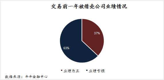 如下圖所示,被借殼前一年超6成上市公司業(yè)績普遍低迷,為虧損狀態(tài)。因并購重組方案從預案到證監(jiān)會審核通過,再到完成實施一般需要經(jīng)過2-3年時間,可能在雙方洽談時上市公司已經(jīng)連續(xù)虧損數(shù)年,但到完成借殼重組前一年因各種原因業(yè)績轉正。所以該數(shù)據(jù)為保守數(shù)據(jù),即被借殼方業(yè)績虧損比例或超7成。