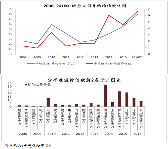 2008年至2016年Q1,據(jù)牛牛金融研究中心統(tǒng)計,借殼方并購對價均值從26.10億元增長到2016年Q1的79.35億元,年復合增長率達到10.33%,而A股從08年最高點5522.78跌到如今的2821.67點,跌幅已近一半。上圖顯示出借殼公司溢價倍數(shù)與其并購均值呈現(xiàn)出高度的正相關關系,并相繼于2010年與2014年達到局部峰值。